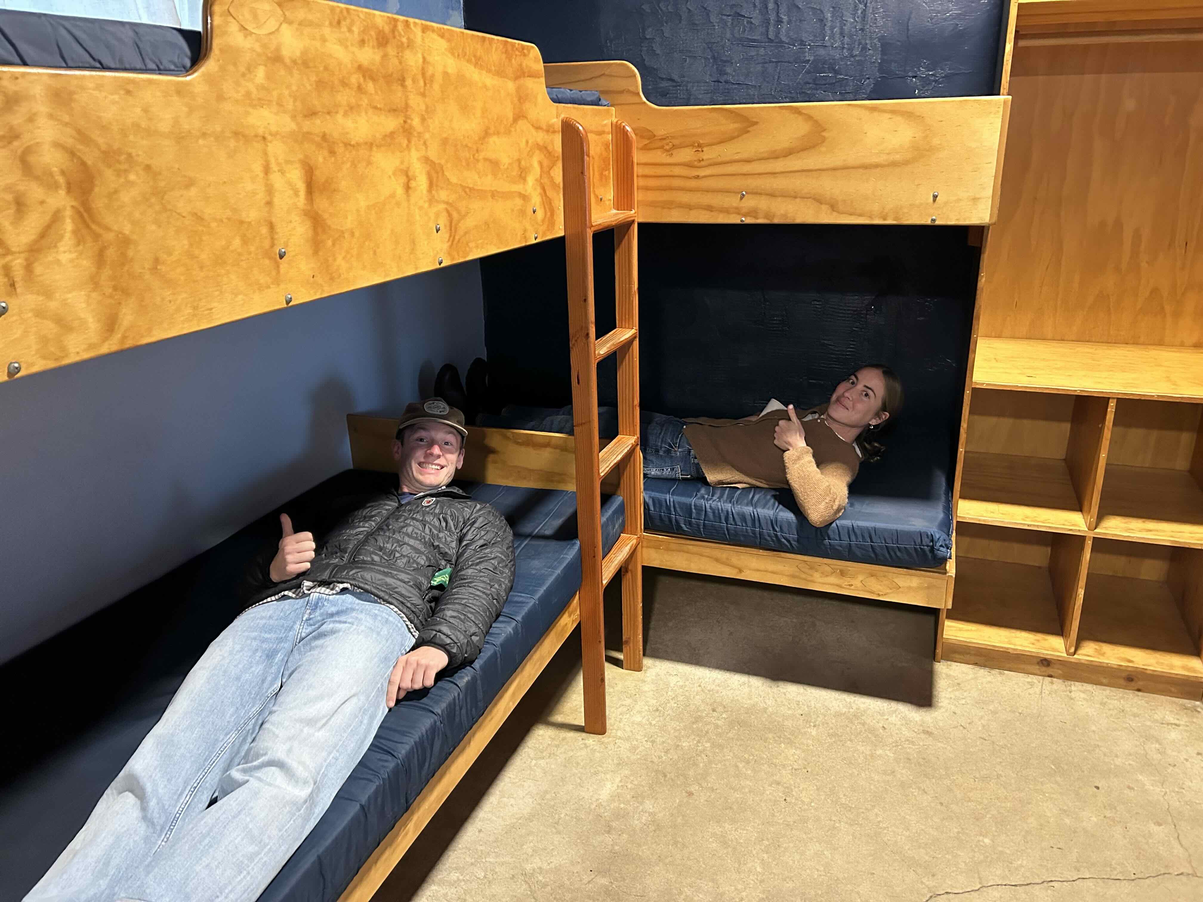 Each cabin contains five bunk beds, for a total of 10 beds per cabin. Each cabin has a bathroom with a sink and a shower, plus an extra sink with a big mirror.